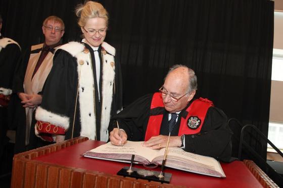 His Highness the Aga Khan signs the guestbook at the University of Ottawa on January 13, 2012, as Diane Davidson, the Vice President of Governance looks on. Photo: University of Ottawa. Copyright.