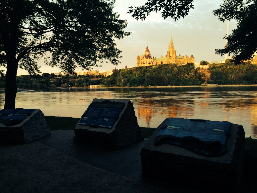 A scene of Ottawa’s emerging skyline inscribed on a stone plaque as seen from Gatineau, Quebec, across the Ottawa River, metres from the Canadian Museum of Civilization. The inscription reads as follows: “Canada has grown and evolved and so have the country’s institutions. In 1867, the new Parliament Buildings welcomed the country’s first government. When Canada became independent from Britain in 1931, new federal institutions were built to support the country’s “coming of age.” In 1967, Canadians celebrated the country’s centennial year and their shared English and French heritage. The government embraced this ideal, and in the 1970’s extended the federal public service into Quebec – a first step toward the creation of a bilingual and culturally representative capital region.” Buildings represented on the plaque (l to r) 1 – National Gallery of Canada; 2 – Embassy of the United States of America; 3 – Canada Revenue Agency; 4 – The Parliament Buildings, 5 – Confederation Building; 6 – Department of Justice; 7 – Supreme Court of Canada, and 8 – National Library and Archives Canada. Photo: Malik Merchant. Copyright. June 2014.