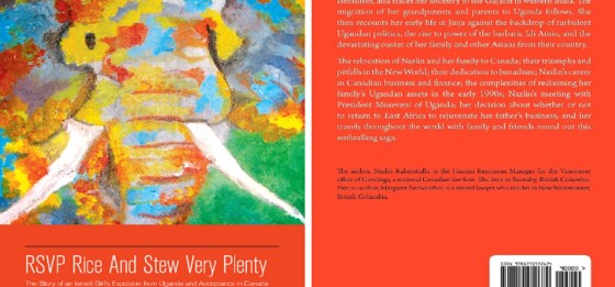 Front and back cover pages of Nazlin Rahemtulla’s autobiography “RSVP Rice and Stew Very Plenty.” 320 pp. Friesen Press, June 2012. Please click on image for enlargement.
