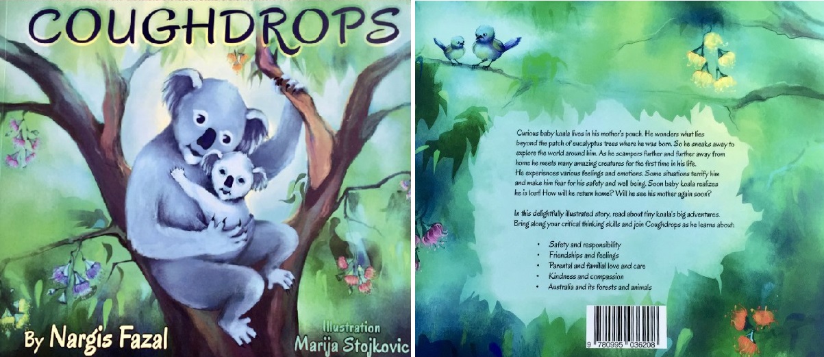 Nargis Fazal: Baby Koala is the main character of my book. He is named “Coughdrops” because he smells like the Eucalyptus trees that he lives on and feeds from.