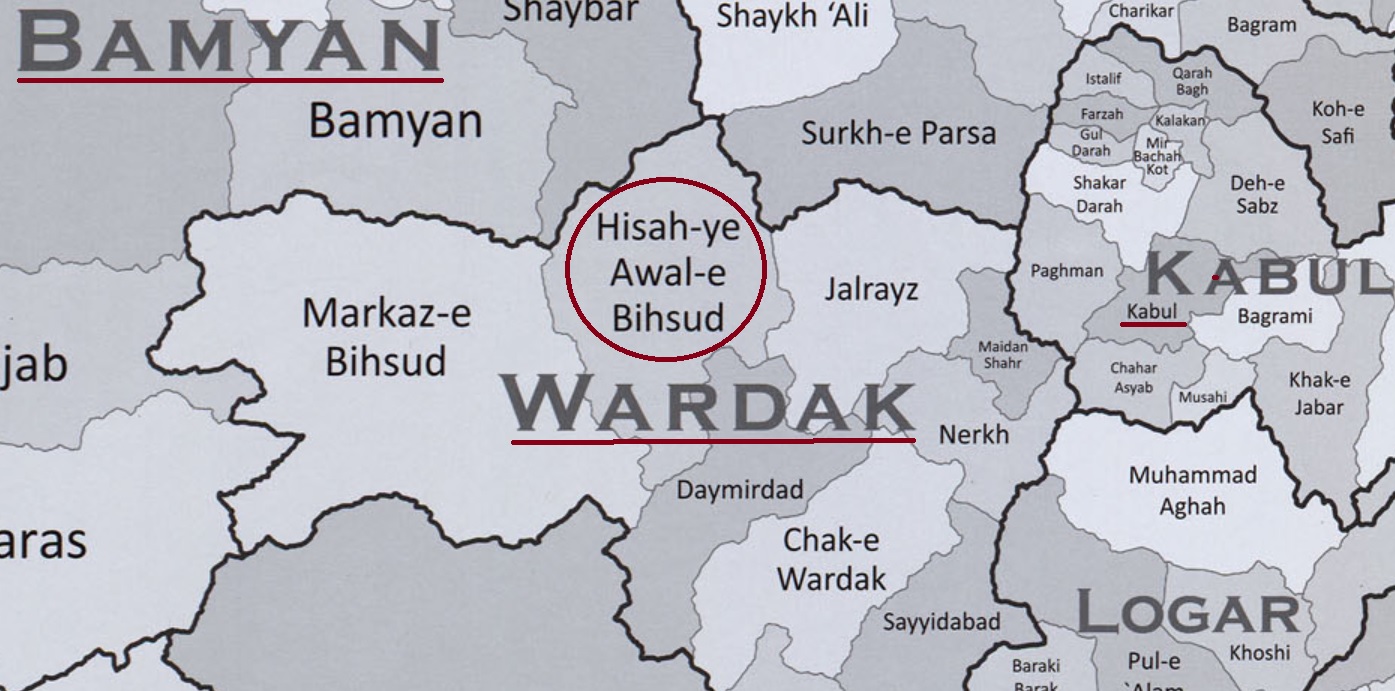 Enlarged map of the Afghan provinces of Bamyan, Kabul and Wardak. The author of this piece visited the district of Hisah-ye Awal-e Bishud (circled) where the remote village of Sia Sang is located at an elevation of 3,117 meters (10226 ft) above sea level. The current daily minimum and maximum temperatures for the week of February 14, 2022 in Sia Sang will be in the range minus 17°C to minus 6°C. The map has been adapted from the provincial map of Afghanistan at the Perry-Castañeda Library Map Collection, University of Texas. For full provincial map of the country, click HERE – it will open in new tab.
