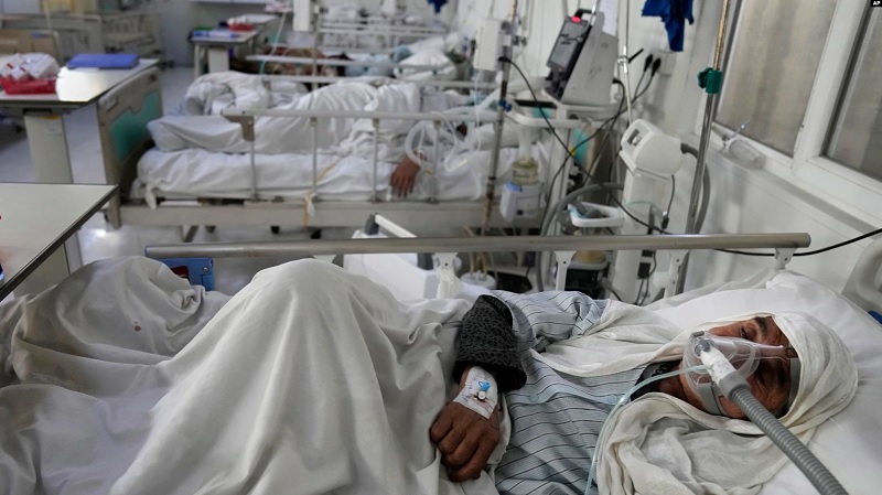 An Afghan patient infected with COVID-19 lies on a bed in the intensive care unit of the Afghan Japan Communicable Disease Hospital, in Kabul, Afghanistan, Feb. 7, 2022. Photo: AP/via VOA