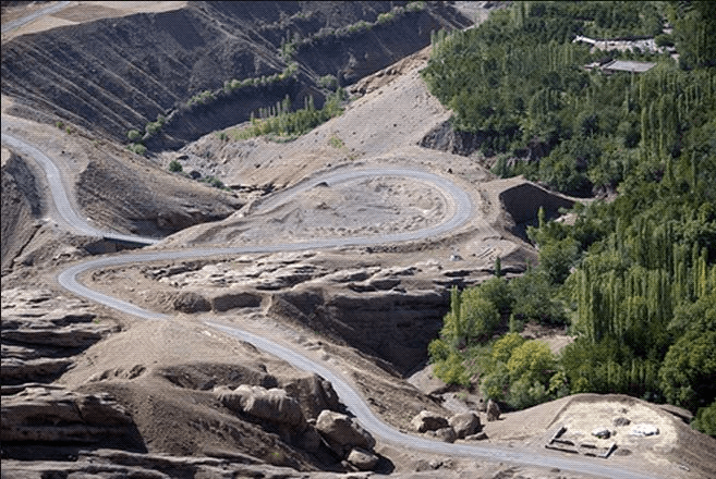 The general aerial view of the Alamut Valley from the top of the Castle. Notice the fine road that has been constructed, making it easier to reach the valley. Photo: Ali M. Rajput Collection