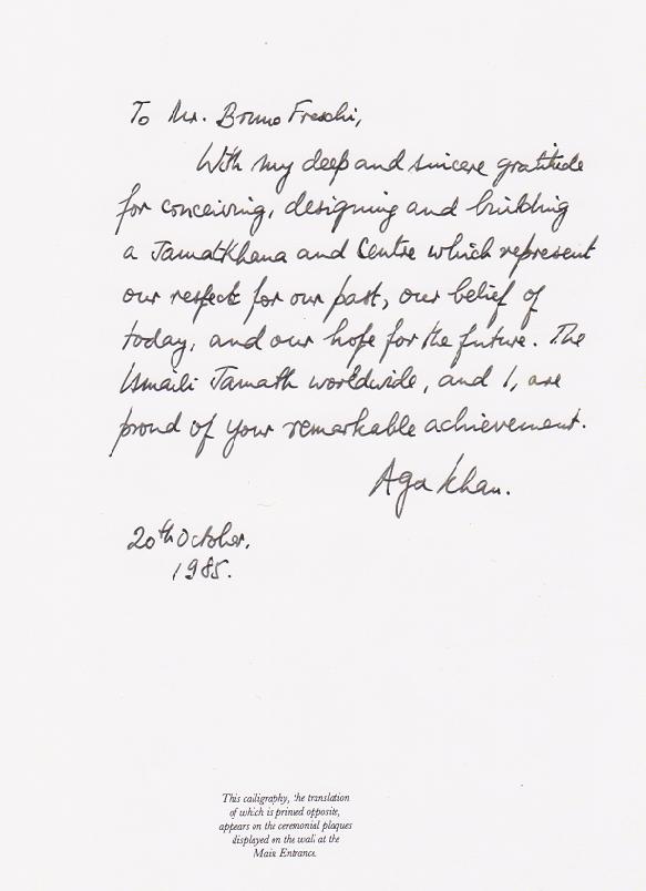 A personal message to the architect from His Highness the Aga Khan. Please see photo gallery for enlargement.