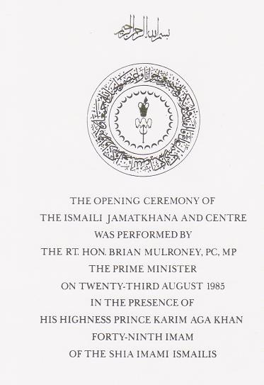 The Ismaili Jamatkhana and Centre was opened by Prime Minister Brian Mulroney in the presence of His Highness the Aga Khan, on August 23, 1985. Bruno Freschi write: “I believe the ultimate purpose of the Jamatkhana is giving iconic foundation to the Ismaili community in Canada. Both His Highness’s and the Prime Minister’s comments in their speeches reflected this very Canadian idea.”