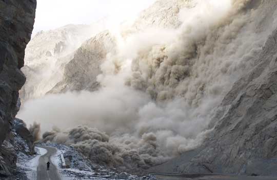 A man stands in the middle of the Karakoram Highway while rocks tumble down into the Hunza River in Pakistan’s Gojal region. The rockslide dammed the river and created Lake Gojal, which submerged eleven miles of the Karakoram Highway and isolated several villages. Photo: Courtesy I. Ali Shimshal/Pamir Times)