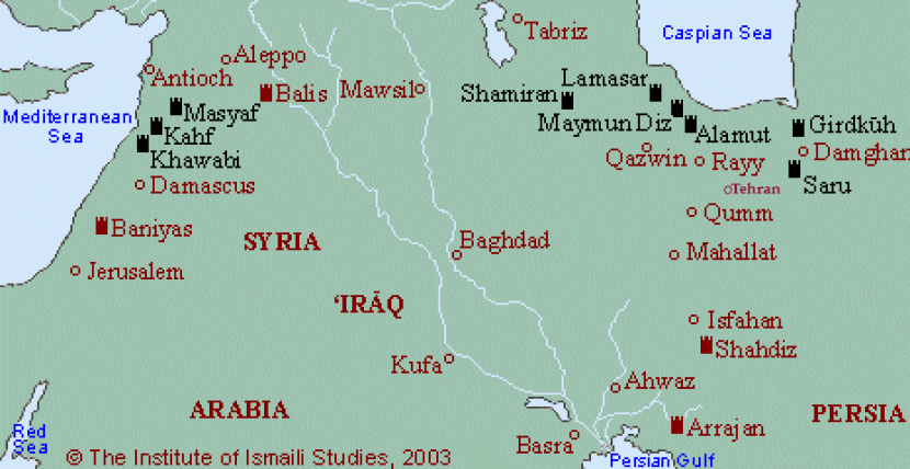 A map showing Ismaili Castles in Iran and Syria. Some of the places Dr. Rajput visited in Iran were Tehran (inserted to original map), Qazvin, Alamut, Lamasar and Mashad (Eastern Iran, not shown above). Map: http://www.iis.ac.uk
