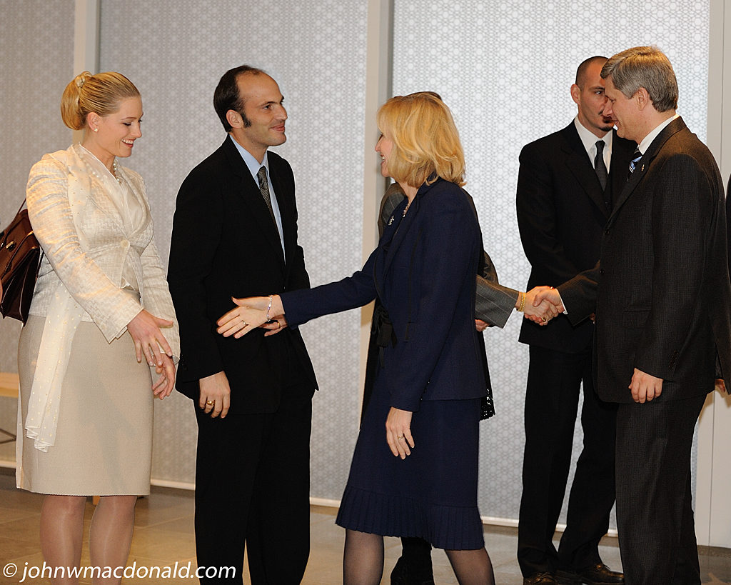 Prince Hussain Aga Khan and his wife, Princess Khaliya Aga Khan, greeting Canada's Prime Minister, Stephen Harper, and his wife, Laureen, as they arrive for the opening of the Delegation of the Ismaili Imamat Buiding in Ottawa on December 6, 2008. Photo © John MacDonald