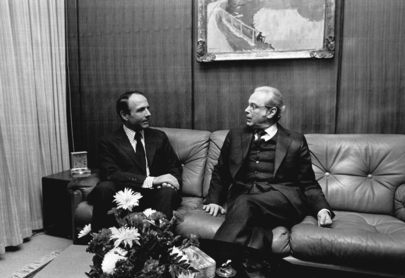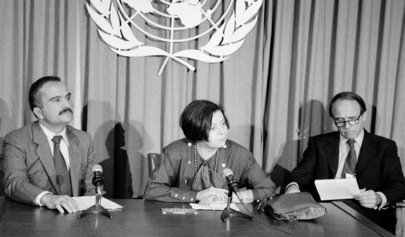 ![]() Javier Perez de Cuellar, former Secretary-General of the United Nations, in a meeting with Prince Sadruddin Aga Khan, former United Nations High Commissioner for Refugees, to discuss his report which had been considered by the Commission on Human Rights in Geneva, and was then referred to the thirty-seventh General Assembly session. Photo Credit: UN Photo |