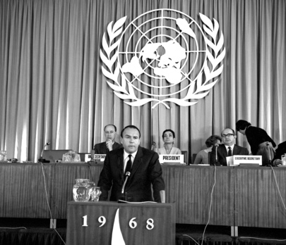 ![]() International Conference on Human Rights Opened in Teheran, 22 April – 13 May 1968. The Conference, called by the General Assembly, served as a major event in the International Year for Human Rights, 1968, which was proclaimed by the Assembly to commemorate the twentieth anniversary of the adoption of the Universal Declaration of Human Rights. Prince Sadruddin Aga Khan, UN High Commissioner for Refugees, seen making a statement at the plenary meeting held on 25 April. Photo Credit: UN Photo |