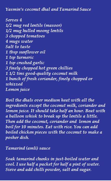 Yasmin A-B: My mum’s Coconut Dhal.  (see recipe above – ed.)