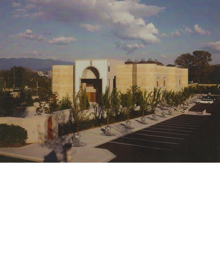 The Ismaili Jamatkhana and Centre, Burnaby. Facts as at 1985: Site Area 14172 square metres, Area covered by building 3870 square metres, Parking 134 spaces