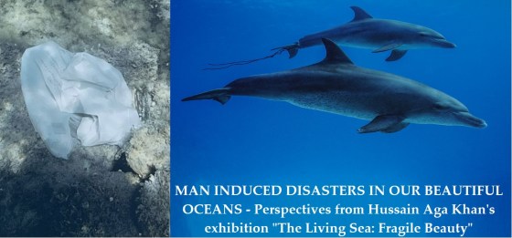 Two photographs captured by Prince Hussain Aga Khan of plastic bags in the ocean (top the Philippines, bottom Sardinia) that alarmed Al-Qawi Nanavati when she visited his exhibition The Living Sea — Fragile Beauty at the Ismaili Centre Toronto; May 22, 2023. Photograph: Al-Qawi Nanavati/Simerg.