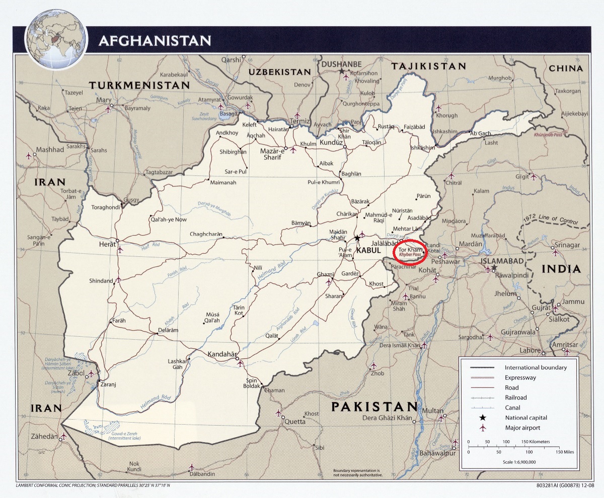 Map of Afghanistan and neighbouring countries. The major international border crossing between Afghanistan and Pakistan, the Turkham (Tor Kham) border, mentioned by our correspondent in his post, below, is circled in red. Known as the Grand Trunk Road, the road connects Nangarhar province of Afghanistan with Pakistan’s Khyber Pakhtunkhwa province. Please click on map for enlargement. Credit: Map adapted and annotated by Simerg from the Perry-Castañeda Library Map Collection, University of Texas.