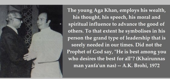 “If it be true that a true test of really great man, as Brougham teaches us, is that he be endowed with three remarkable attributes, namely, (a) generosity in design; (b) humanity in execution; and (c) moderation in success, then I have not the slightest hesitation in saying that the Aga Khan answers that test adequately. He is an indefatigable worker and has a tremendous power of uptake. He has a way of bearing the burdens of the leadership he is called upon to provide, cheerfully. He is calmest in storms, and most fearless under menace and his reliance on truth, on virtue and on God who, after all is their source and sanction, is ever so unfaltering” — A. K. BROHI, JULY 11, 1972 – READ BROHI’S TRIBUTE BY CLICKING HERE OR ON PHOTO BELOW
