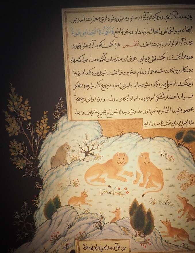 A display at the Remastered exhibition which was launched recently at the Aga Khan Museum, and continues to March 21, 2021. Here the jackal Dimneh is brought before the Lion-King and his mother. Illustration from a manuscript of Anvar-i Suhaili, Iran 1593. Photo: Malik Merchant / Simerg.