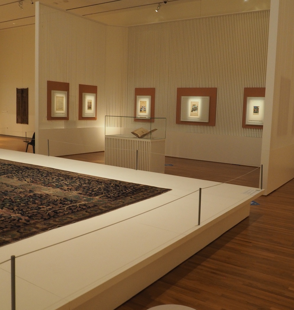 A view of the Aga Khan Museum’s folios from manuscripts of Shahnameh, The Books of Kings, that were produced between 13th-16h centuries. At the near end is the famous Wagner Carpet depicting “Islamic Garden of Eternal Bliss.” Photo: Malik Merchant / Simerg.