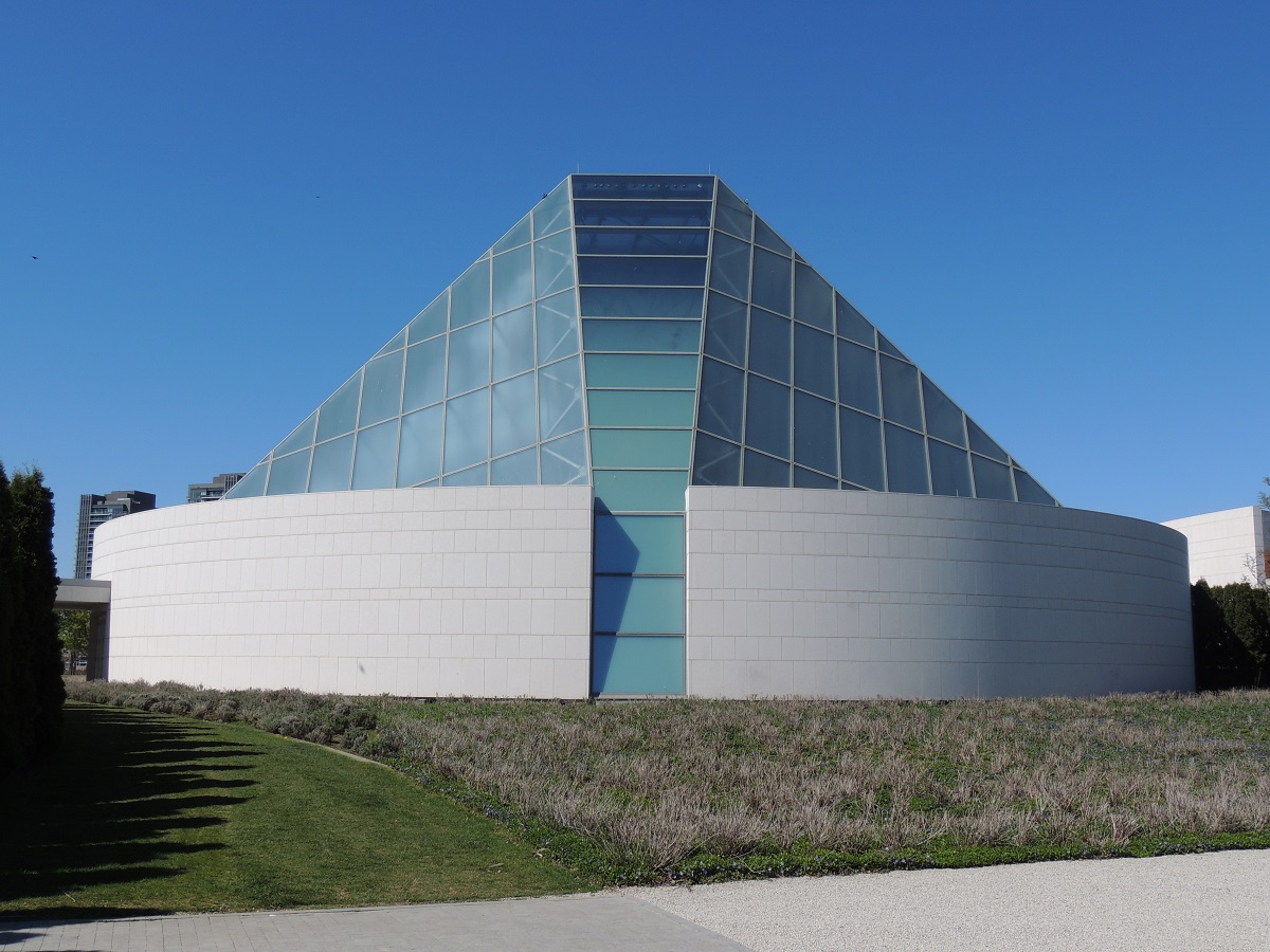 A view of the Aga Khan Museum and the Ismaili Headquarters Jamatkhana dome from the grounds of Aga Khan Park. Photo: Malik Merchant/Simerg.