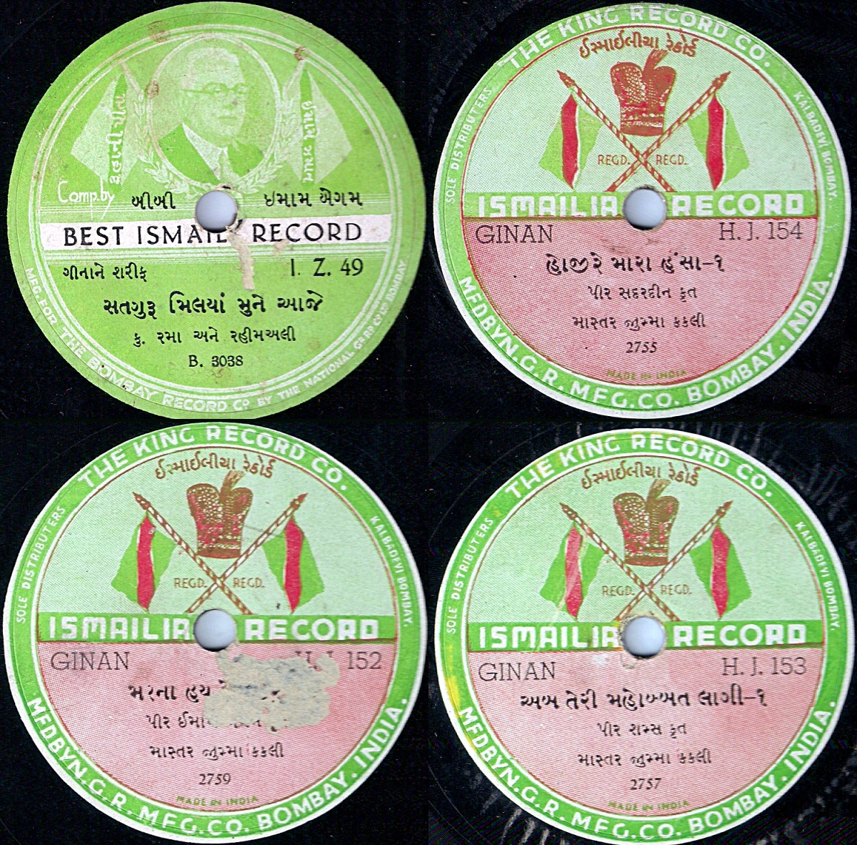 On three of the ginan recordings, the disc label states ‘Ismailia Record’, along with the following: Manufactured by National Gramophone Record Manufacturing Company, Bombay, India [and] Sole Distributers [sic], The King Record Company, Kalbadevi, Bombay. The ‘Ismailia Record’ ginan recordings are in the voice of Master Jumma Kakali. On the fourth ginan recording, the disc label states ‘Best Ismaili Record’, along with the following: Manufactured for the Bombay Record Company by the National Gramophone Record Company Limited, Bombay.