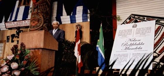 Nelson Mandela was invested as an Honorary Companion of the Order of Canada by the Late Right Honourable Roméo LeBlanc, 25th Governor General of Canada, on September 24, 1998. Photograph: Canadian Heritage/Government of Canada website.