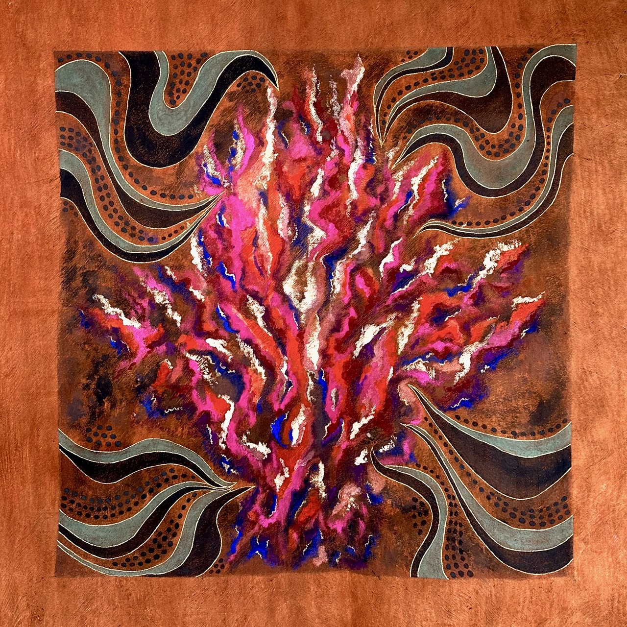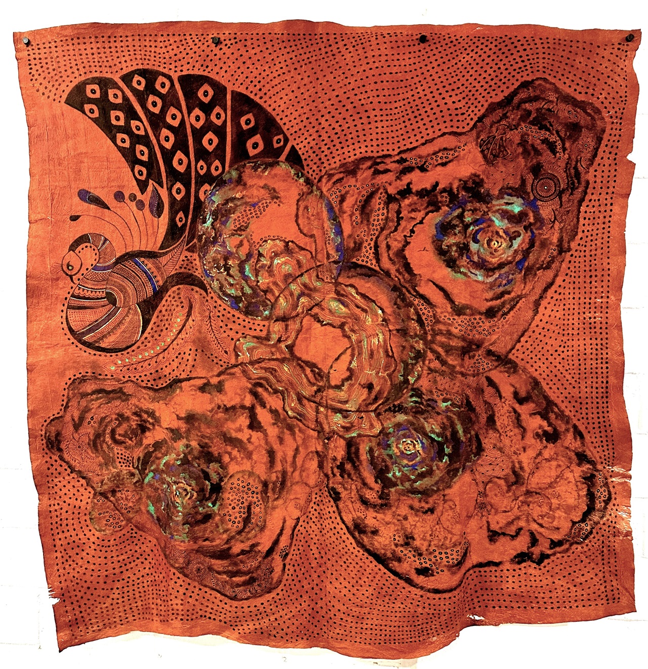 Flames of Creation in the Garden of Eden by Shafina Jaffer. Medium: Bark cloth, natural pigments: 22K Gold, cow bone pigment, malachite crystal, Majorelle blue, charcoal, rose madder, Masaai hair pigment, Tanzanian clay. Size: 80 x 80cm (31.4 x 31.4in). Photograph: Shafina Jaffer collection.