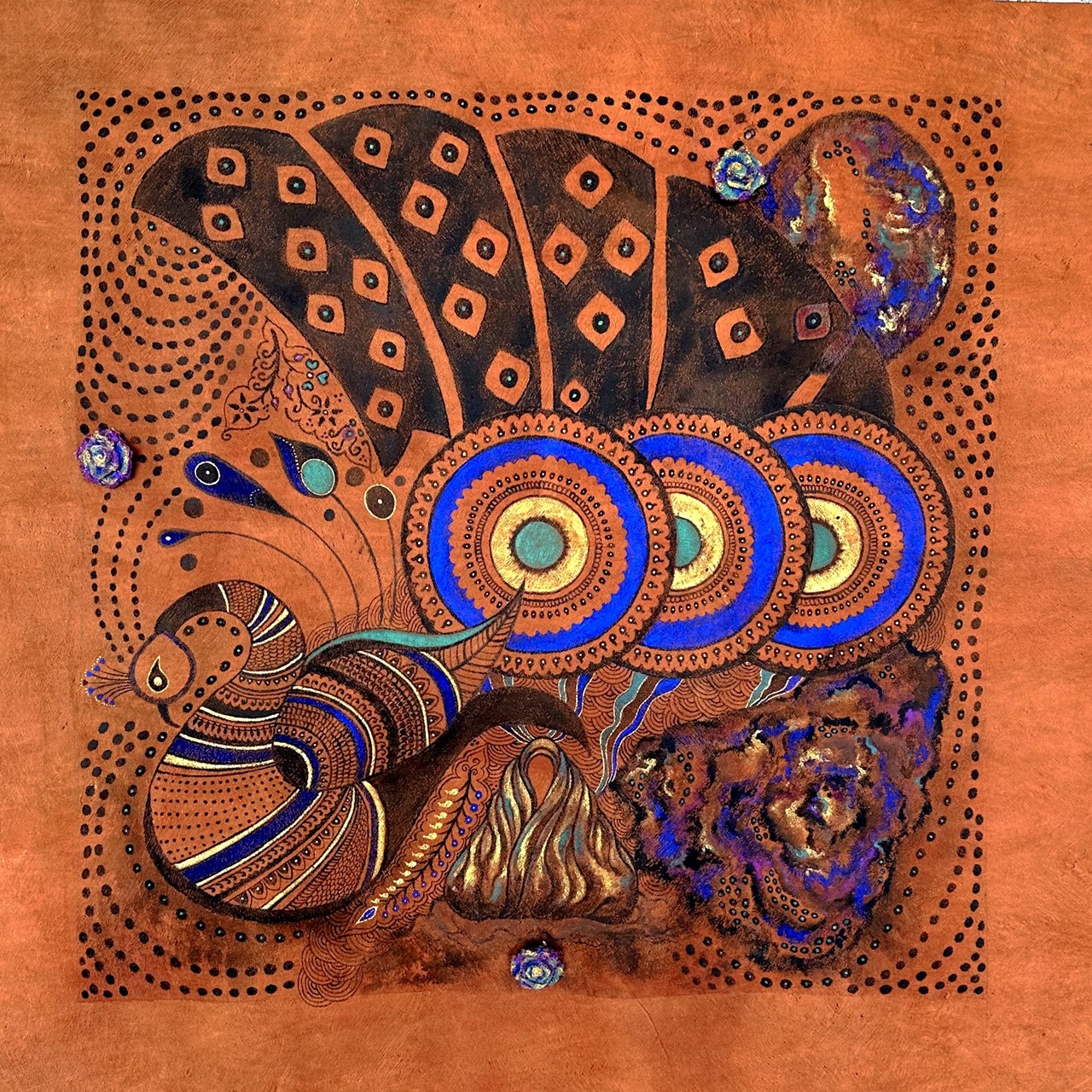 Voices of Creation, by Shafina Jaffer. Medium: Bark cloth, natural pigments: 22K Gold, cow bone pigment, malachite crystal, Majorelle blue, charcoal, Masaai hair pigment, rose madder, spinnel black, zinc white, Tanzanian clay. Size 40 x 40 cm ( 31.5 x 31.5in). Photograph: Shafina Jaffer collection.