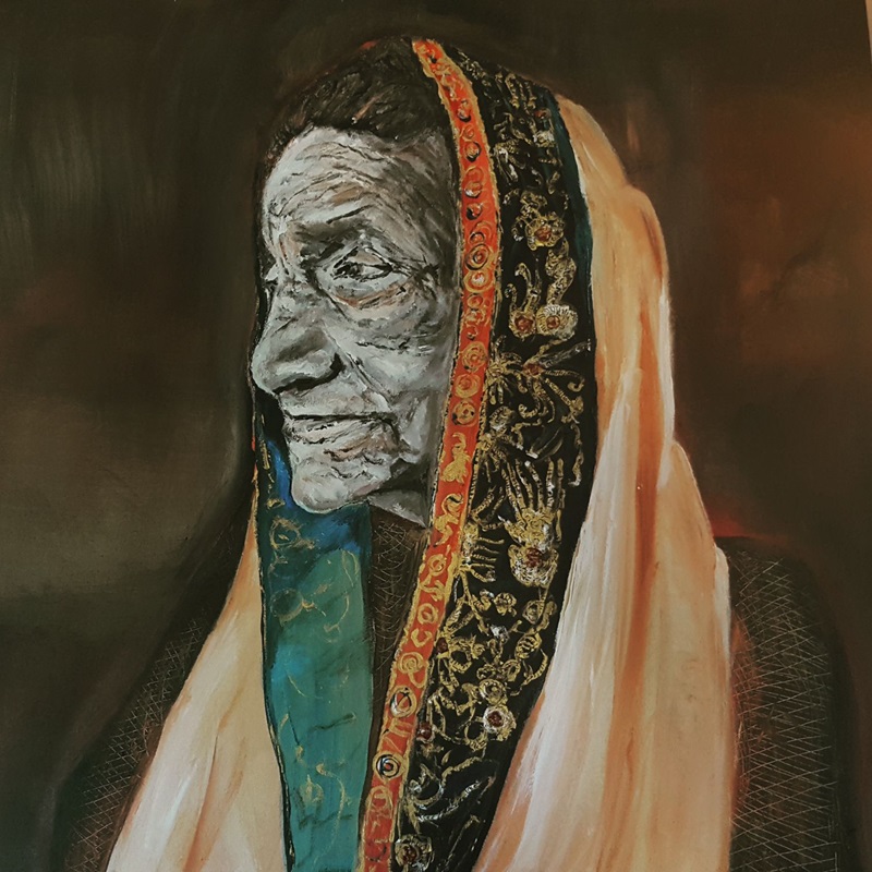 Dadimaa, Acrylic on Canvas,30″ x 30″, July 2017, painting by Mehboob Rajwani