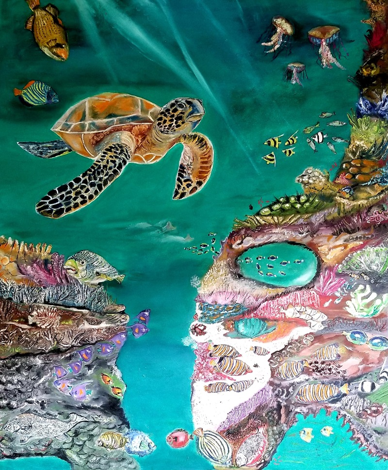 I used oil paints to create an imaginative multi-coloured reef in an aquamarine background with a swimming turtle, exotic fish, and other colourful species. This work also depicts the gradual extinction of coral as it becomes dead and bleached, thus reducing the number of inhabitants.