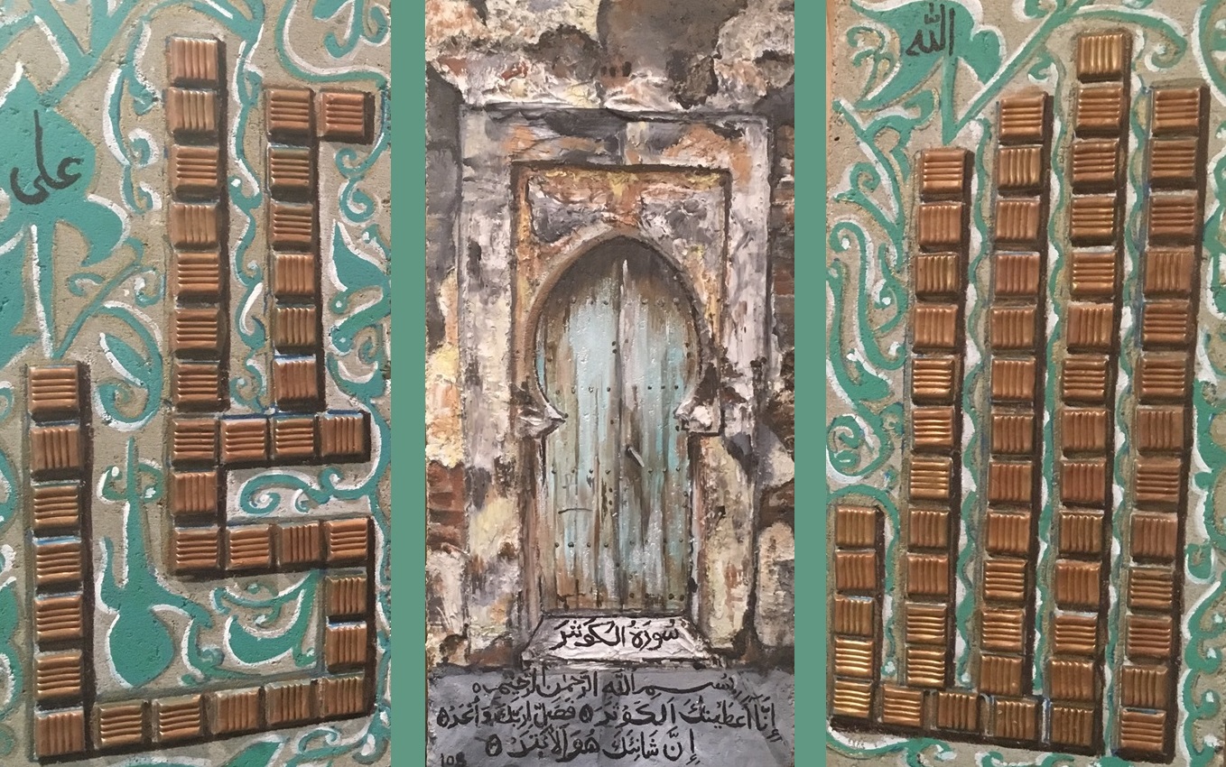Heavenly Abode, Mixed Media, 11″ x 17″, a three-panel display of tiled artwork depicting (left) Ali; (centre) Qur’anic verses 108:1-3, “In the Name of Allah, the Most Gracious, Most Merciful Indeed, We have granted you (O Muhammad) Alkausar. So pray to your Lord and sacrifice. Indeed, your enemy is the one cut off (from the root); and (right) Allah. The panels were displayed at the Diamond Jubilee Art Exhibition in 2018 as one exhibit (not exactly as shown). Art by Salma Jadavji, Calgary