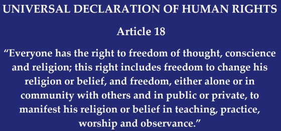 “Everyone has the right to freedom of thought, conscience and religion; this right includes freedom to change his religion or belief, and freedom, either alone or in community with others and in public or private, to manifest his religion or belief in teaching, practice, worship and observance.”