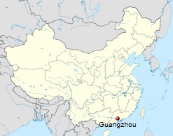 Location of Guangzhou in China. Historically know as Canton, it is the 3rd largest city in China with a population of nearly 13 million. Map: Wikipedia