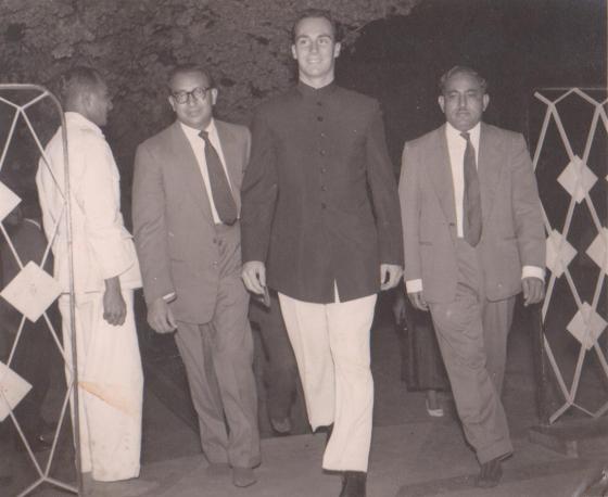 Mawlana Hazar Imam entering Eastleigh Jamatkhana, Nairobi, with Mukhi Valimohamed (right) and Kamadia Kassam. The exact date of this photo is not known but it appears to be from the late 1950's or very early 1960's. Photo: Nashir Kassam Family Collection. Copyright.