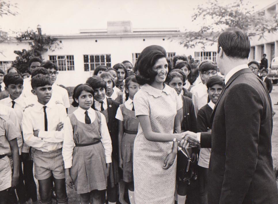 Happy and excited students look on as their teacher greets His Highness the Aga Khan during his visit to the Aga Khan Primary School, Parklands, Nairobi, in 1966. Nashir Kassam was a student at the school and is seen in the front row, at right, looking at His Highness the Aga Khan with a wide smile. Other students are invited to identify themselves and their teacher shown in the photo, and send the information to Simerg. The caption will be updated as and when the revisions are received. Photo: Nashir Kassam Family Collection. Copyright.