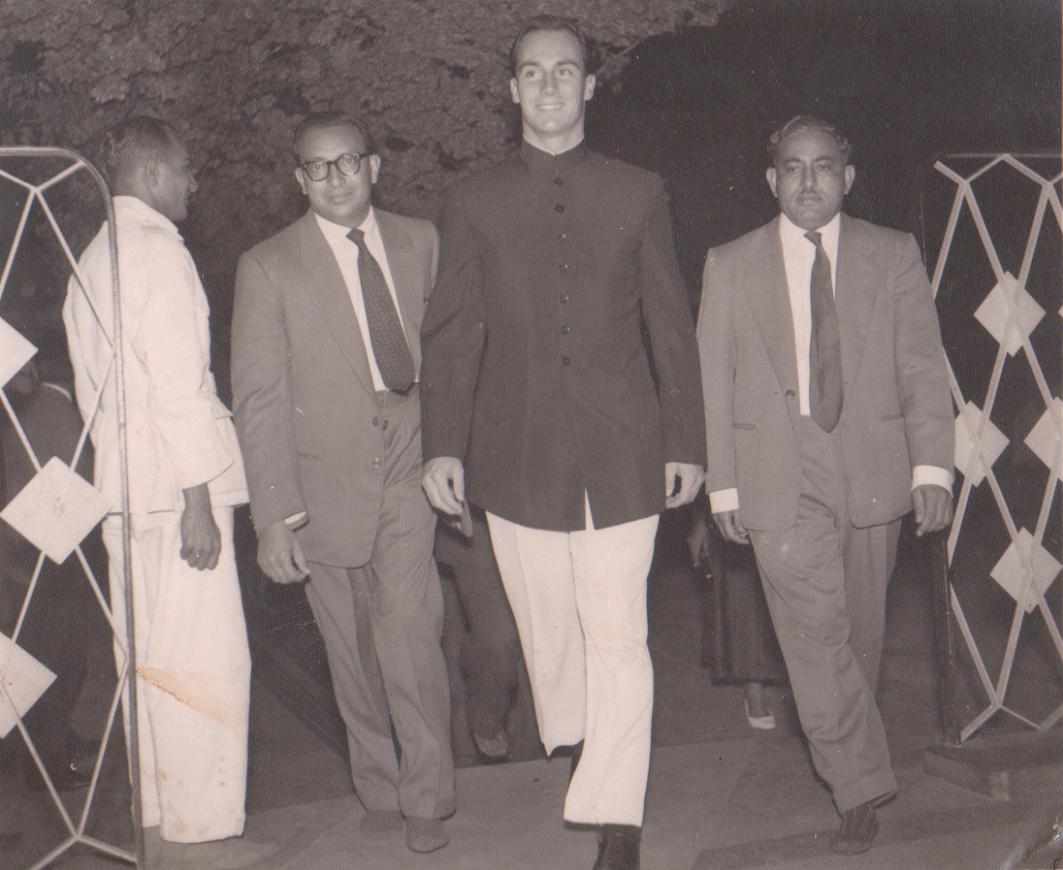 Mawlana Hazar Imam engaged in a conversation at a function held during the late 1950's or early 1960's. Standing behind him in a light suit is Ramzan Kassam and next to him on the right his brother, Nurmohamed Kassam. Photo: Nashir Kassam Family Collection. Copyright.