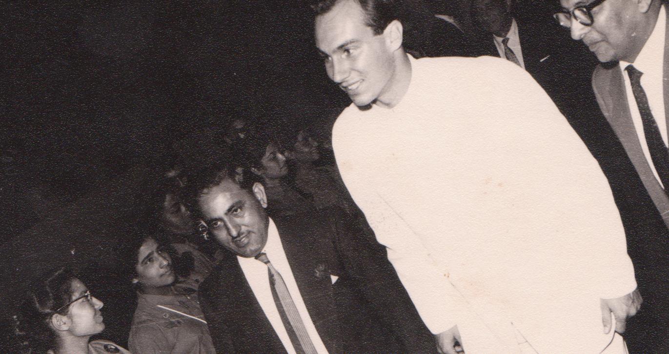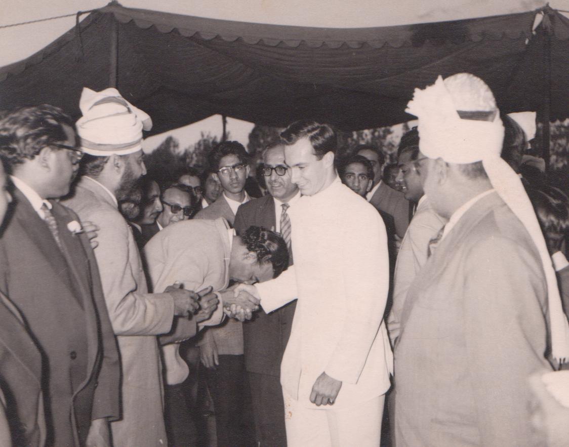 Mawlana Hazar Imam being respectfully greeted by Ramzanali Kassam at a public function held in Nairobi, Kenya. The exact date of this photo is not known but it appears to be from the late 1950's or very early 1960's. Photo: Nashir Kassam Family Collection. Copyright.
