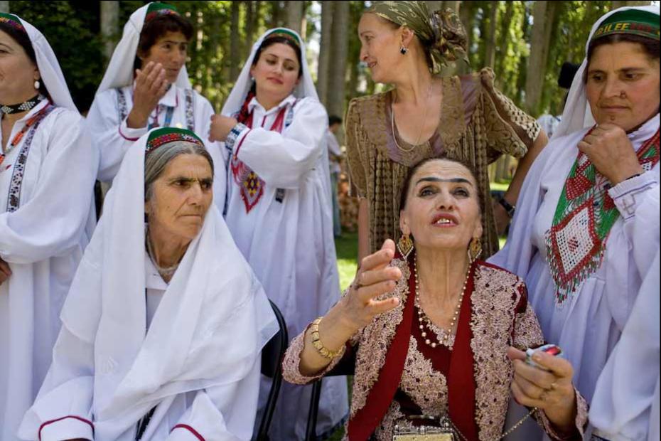 Ismaili women in the Pamirs. Note the Golden Jubilee head band on the woman on the right. Click for enlargement. Photo: Matthieu Paley. Copyright.