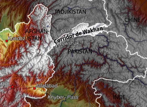 The Wakhan Corridor is commonly used as a synonym for Wakhan, an area of far north-eastern Afghanistan which forms a land link or “corridor” between Afghanistan and China. The Corridor is a long and slender panhandle or salient, roughly 140 miles (220 km) long and between 10 and 40 miles (16 and 64 km) wide. It separates Tajikistan in the north from Pakistan in the south. The map also shows the Panj River. It is a tributary of the Amu Darya. The river is 1,125 km long and forms a considerable part of the Afghanistan – Tajikistan border. Map and caption: Wikipedia.
