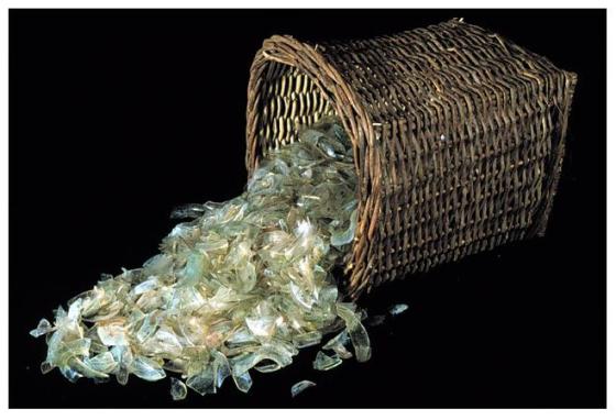 Almost certainly transported in wickerwork baskets, it was being carried in place of stone ballast in the after quarter of the hold. Shipping glass cullet cheaply as ballast often made economic and/or technical good sense, since melting glass requires a much lower temperature than making glass does and a desired kind of glass can not always be made from locally available raw materials.