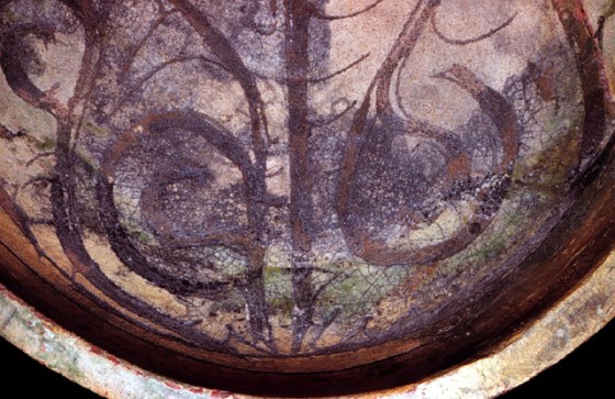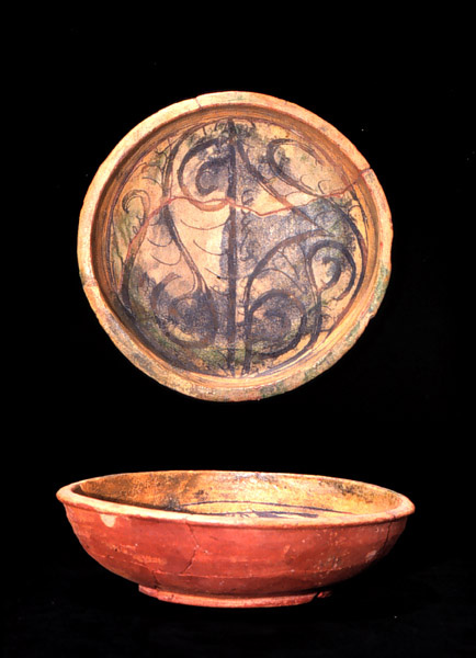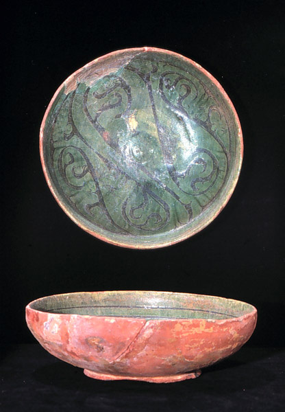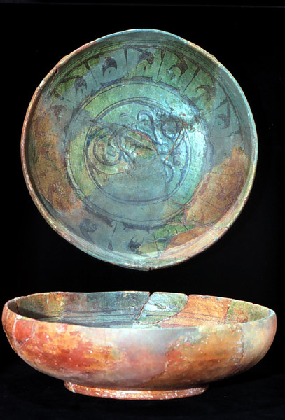 The Serçe Liman1 ship was carrying almost four dozen Fatimid glazed bowls. This bowl is an example of both splash ware and sgraffito ware, in which decorative designs are carved into the clay. INA Photo. Copyright.