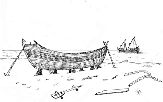 Hypothetical drawing of the modest sized Serçe Liman1 ship during construction. A similar, fully rigged ship can be seen in the background. Photo credit: INA. Copyright.