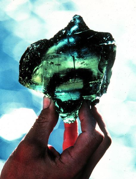 An emerald green glass chunk. This piece was one of over 2 tons of glass recovered from the ship. The glass came from a factory on the Fatimid Syrian coast. Photo credit: INA. Copyright.