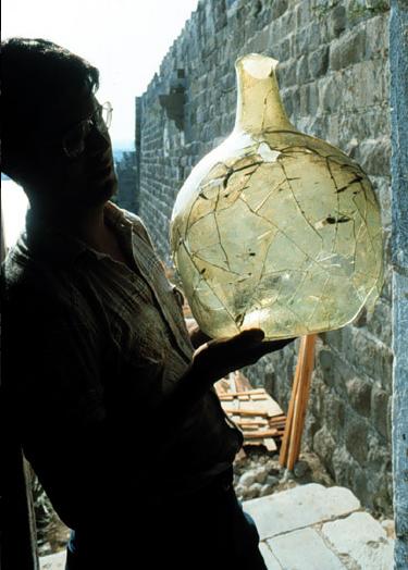 This reconstructed bottle is probably the largest surviving glass bottle from antiquity. Photo credit: INA. Copyright