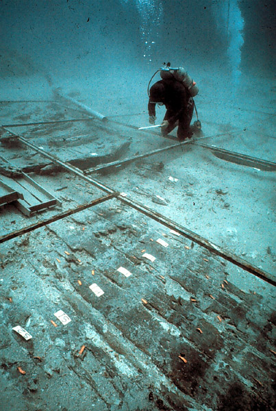All of the ship's hull timbers were labeled on the sea floor. The surviving planking can be seen in the foreground marked with white tags. Photo credit: INA. Copyright.