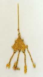A gold brooch that was designed to hang from the chest by means of a pin attached to the wearer’s clothing. It takes the shape of an upside-down heart and was produced from a web of moulded gold. On its frame are tiny rings, from which hang chains that terminate in different forms: a ball, a bird, a crescent-moon and a knot, all fashioned from woven gold filaments.