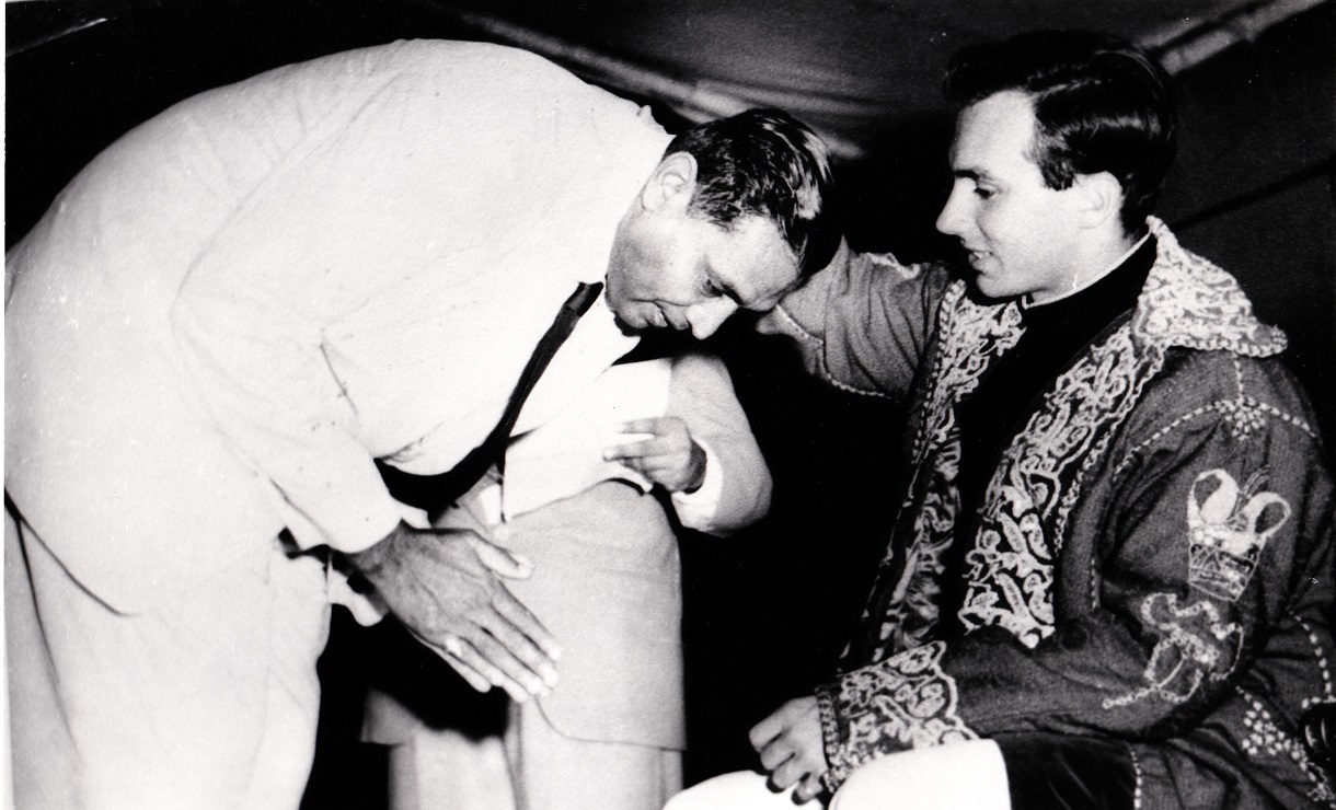 Mawlana Hazar Imam, His Highness the Aga Khan, blessing Vazier Rajabali Meghji Visram during his visit to Dar-es-Salaam, Tanzania (then Tanganuika) in October 1957. Phooto: Sadru Meghji Collection, Toronto.  Please click on photo to enlarge)