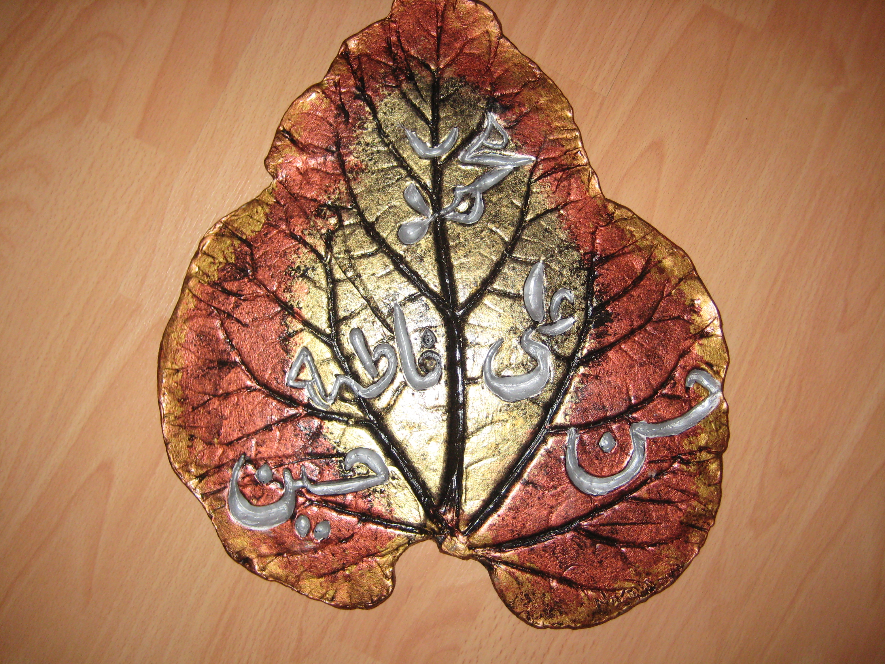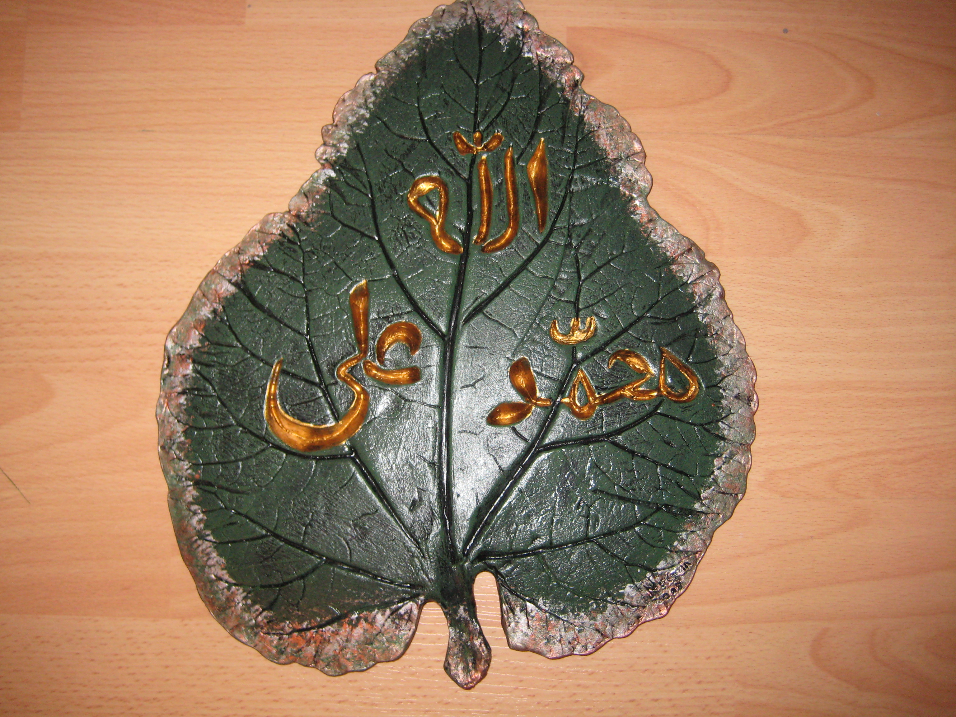 The art inspiration comes from the green leaves of a Zucchini plant where nature submits to Allah, the Creator, the Merciful and the Benevolent. In turn, Allah returns the fruits of love, light and joy. The art inscription at the top says Allah, and bottom (left to right) Muhammad and Ali.