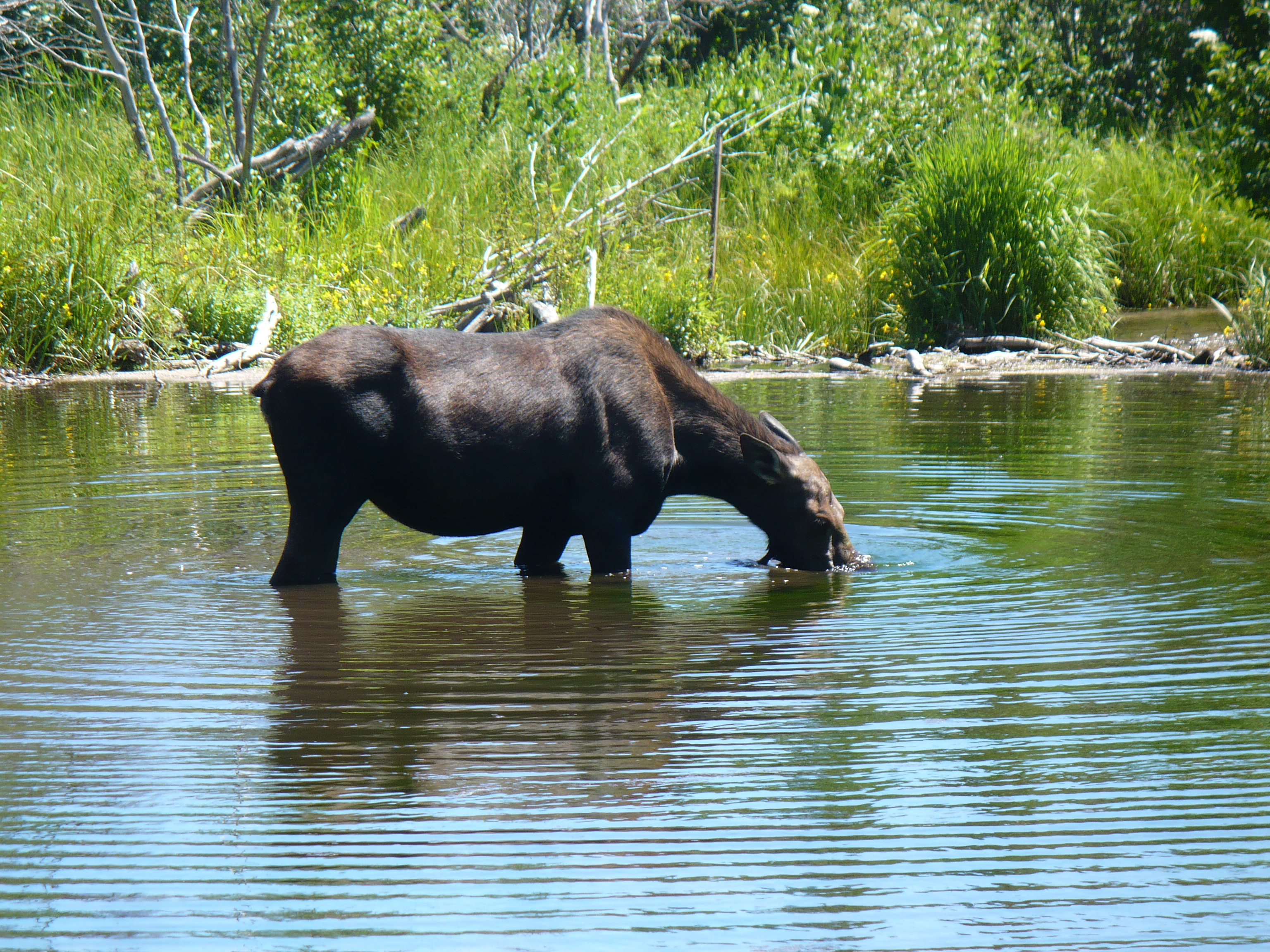 The safari with Kyle was scheduled to finish by 11 am but he showed no rush to return, and spent another extra hour. Finally, after a delightful and unforgettable venture into the Tetons he dropped us at our hotel but not before stopping at the ‘moose pond’ where we had passed earlier in the day. A male moose was now standing in the pond. We took some photos, knowing that we would return to the pond later by ourselves. We had an excellent and flavourful spicy lunch at the Teton Thai and as much as we wanted to take the highly recommended aerial tram to the of Rendezvous Mountain, we decided to forgo it in favour of our ‘own’ afternoon adventure to see the wildlife again. When we returned to the ‘moose pond’, the male had bequeathed his territory to a female moose. We got out of the car and made to it as close as possible to the pond, before a ranger arrived and asked us to return to safer grounds.