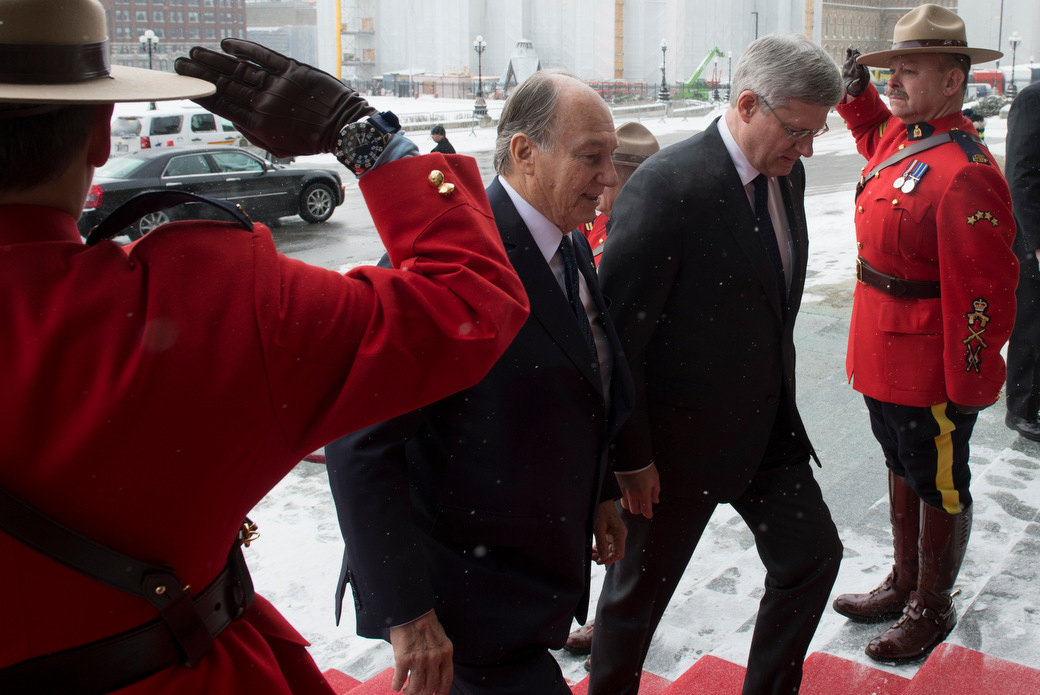 His Highness the Aga Khan is applauded by the Prime Minister, Members of the House, as well as other distinguished visitors as he arrives in the House of Commons on Thursday, February 27, 2014 to deliver a rare address – the first by a faith leader in 75 years. The Ottawa Citizen published a similar photo on its front page of Friday February 28, giving it the title “In Divine Company.” Alongside the Ismaili Imam are his daughter Princess Zahra and the Prime Minister’s wife, Laureen Harper. Others in the photo, in rows adjacent to Mrs. Harper (l to r) — 1st row: The Aga Khan’s younger brother, Prince Amyn Muhammad Aga Khan, Chief Justice of the Supreme Court of Canada, The Right Honourable Beverly McLachlin, Former Governor General of Canada, The Right Honourable Adrienne Clarkson, and renowned Canadian author, intellectual and philosopher, John Ralston Saul; 2nd row (l to r). President Malik Talib of the Aga Khan Ismaili Council for Canada, Prince Hussain Aga Khan, Princess Salwa Aga Khan and her husband Prince Rahim Aga Khan – with both the Princes in the row being the Aga Khan’s children. Photo credit: The Office of the Prime Minister of Canada.