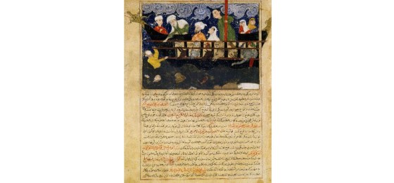 Miniature from Hafiz-i Abru’s Majma al-tawarikh. “Noah’s Ark”, Herat 1425. Leaf: 42.3 × 32.6 cm. The scene on the stormy sea is quite dramatic, with the fluttering sail, the ark breaking out of the picture frame, and the swollen bodies. The animals that are to populate the earth are rendered both humorously and fairly realistically. Photo: The David Collection, Denmark.