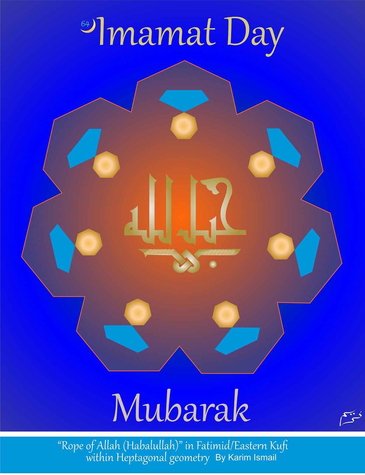 This important tradition appears in the card within heptagonal geometry (seven-sided polygon) about which the (Late) Karl Schlamminger, creator of extraordinary designs and distinctive calligraphies for the Ismaili Centres in London, Lisbon and Toronto, observed as follows in an essay for Arts & The Islamic World (volume 3, number 3, page 25-26):